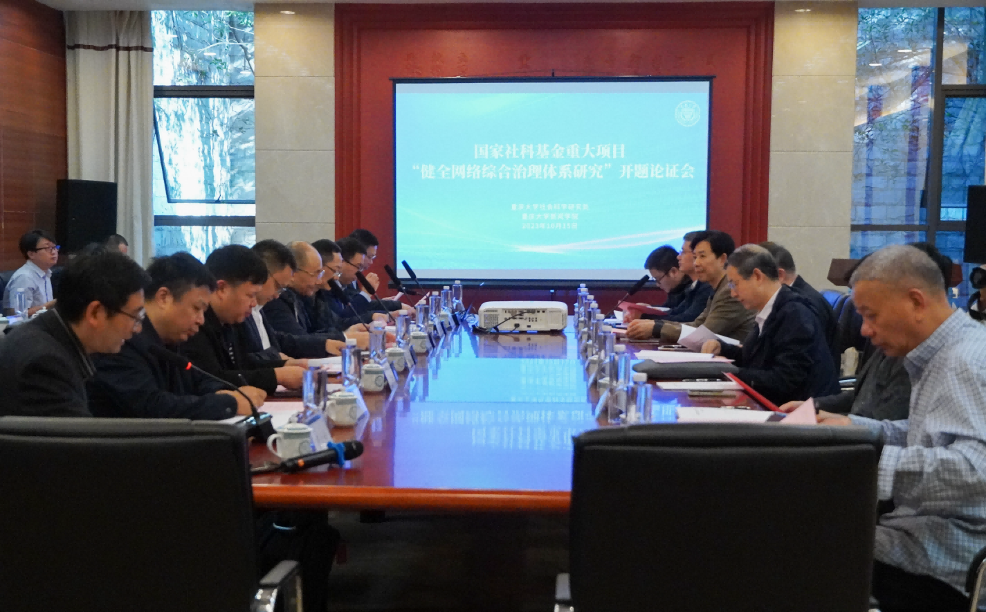 2023年10月15日上午,由重庆大学新闻学院曾润喜教授担任首席专家的研究阐释党的二十大精神国家社科基金重大项目“健全网络综合治理体系研究”开题论证会在重庆大学虎溪校区举行。