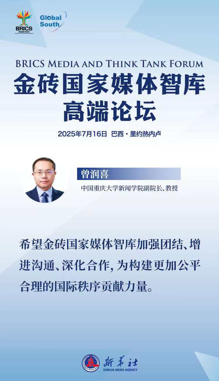 2025年7月15-17日,曾润喜教授受邀参加在巴西里约热内卢举行的金砖国家媒体智库高端论坛,并在“‘金砖声音’提升全球南方话语权”主题单元做了题为《金砖国家媒体应对美加征中国关税的集体努力》的主题发言。会议期间,曾润喜教授与多国专家学者展开了友好交流。新华社配图刊发了曾润喜教授的观点。