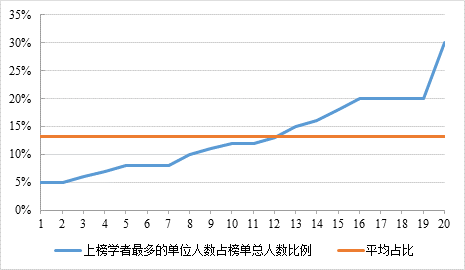 通过分析20个一级学科排行榜,上榜学者最多的单位人数占上榜总人数的比例,发现占比最少的是5%,占比最多的可达30%;占比5%-10%的有8个单位,10%-20%的有11个单位,20%-30%的有1个单位;平均占比为13.2%,有8个一级学科在平均占比之上(图3)。在各一级学科排行榜中,上榜学者最多的单位,其人数占整个上榜总人数的比例集中在10%-20%,可见上榜学者人数最多的单位在一级学科中的影响力举足轻重。