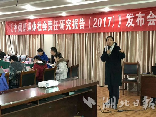 湖北日报讯(记者余宽宏)1月6日,《中国新媒体社会责任研究报告(2017)》在武汉发布,皮书主编、华中科技大学新闻与信息传播学院钟瑛教授主持了发布会。《中国新媒体社会责任研究报告(2017)》由中国网络传播学会与华中科技大学新闻与信息传播学院主编,汇集全国十多家单位、三十多位新媒体前沿观察者的研究成果。自2014年首部新媒体社会责任蓝皮书出版以来,该研究团队已连续4年对新媒体社会责任履行状况进行系统考察和评价。