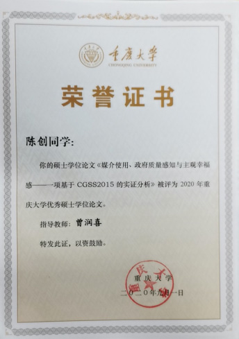 2020年9月1日,由曾润喜老师指导的硕士生陈创的硕士学位论文《媒介使用、政府质量感知与主观幸福感——一项基于CGSS2015的实证分析》被评为2020年重庆大学优秀硕士学位论文。