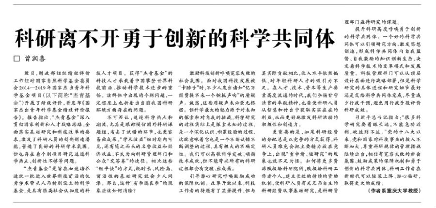 7月28日,曾润喜教授在《光明日报》(2020年07月28日02版)发表题为《科研离不开勇于创新的科学共同体》的时政评论。文章指出了当前我国科研环境方面存在的问题,并提出三点建议。以下是评论原文。