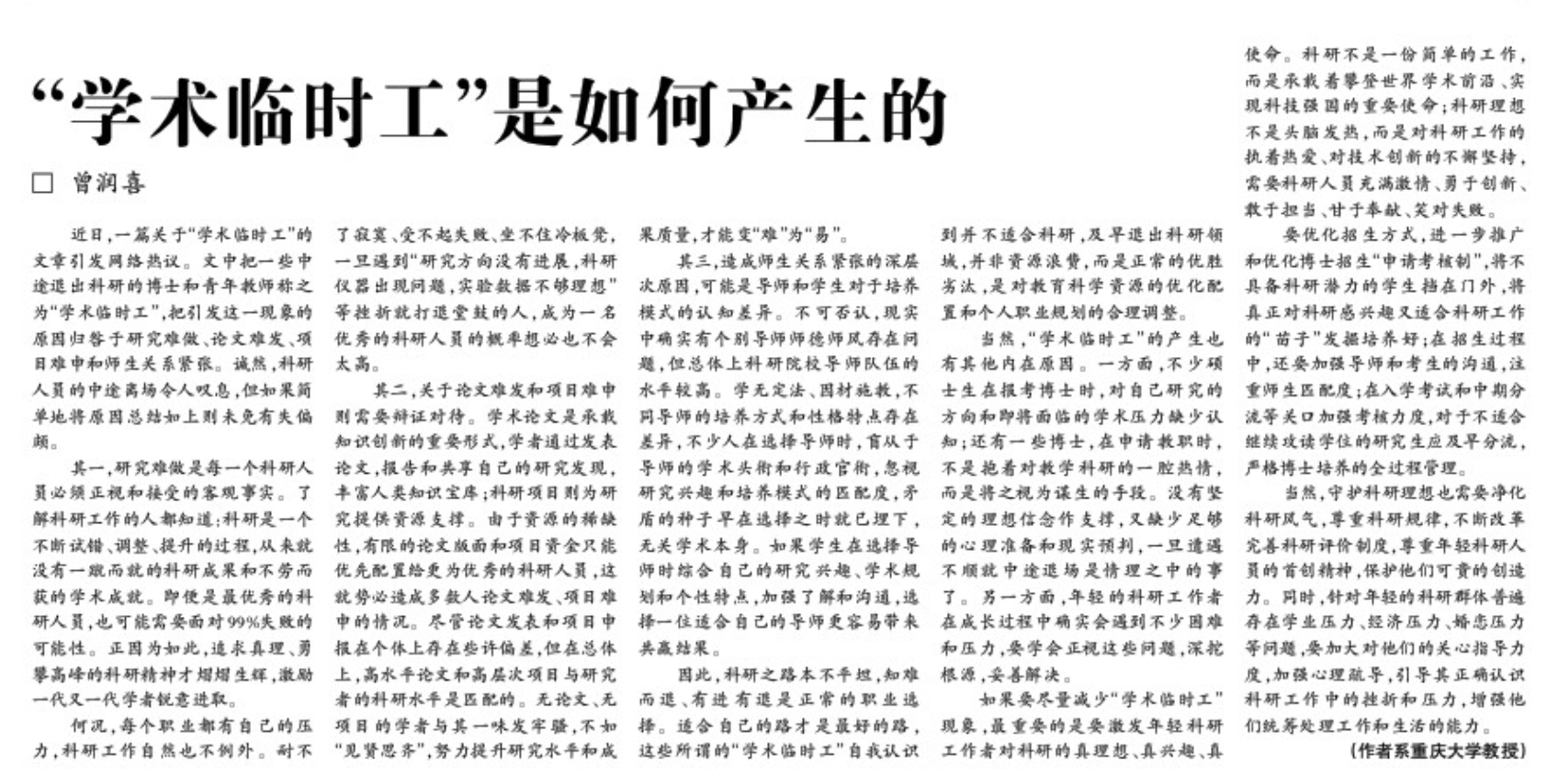 12月15日,曾润喜教授在《光明日报》(2020年12月15日02版)发表题为《“学术临时工”是如何产生的》的评论。文章探析了“许多博士和青年教师中途退出科研圈子,沦为‘学术临时工’”这一现象背后深层次的原因,并提出了三点建议。以下是评论原文。