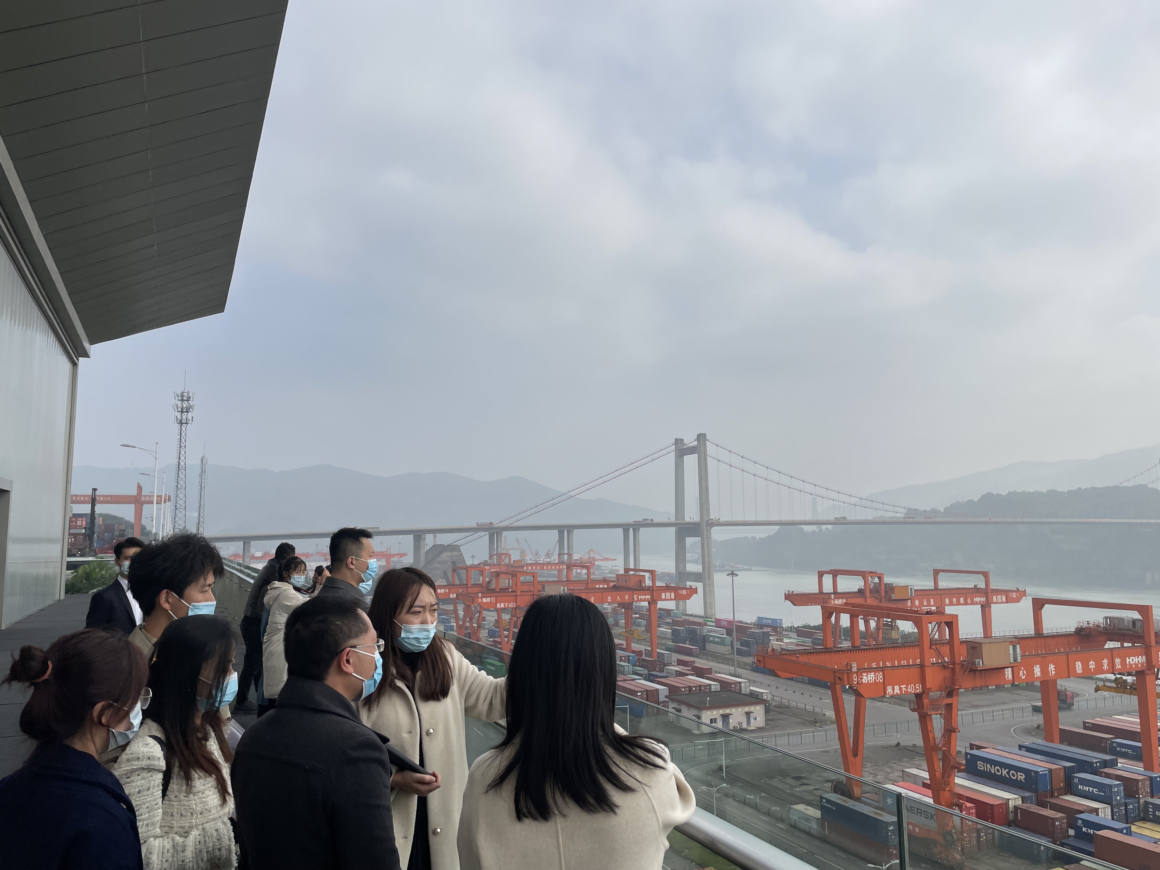 果园港、悦来国际会展中心是两江开放文化“名片”。果园港是中国内陆最大的多式联运枢纽港口,西部唯一港口型国家物流枢纽。团队成员现场观看了国际集装箱从船舶上抓取上岸、抓放于运输货车的全过程。在展厅,工作人员解说了果园港的建设历程。果园港相关负责人与课题调研团队进行了友好的座谈。