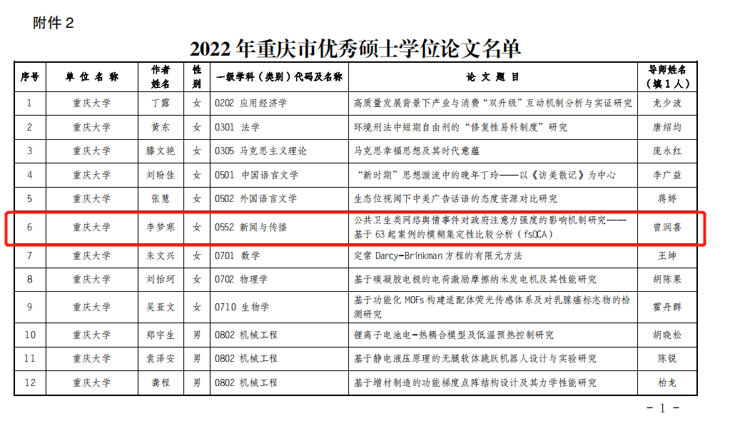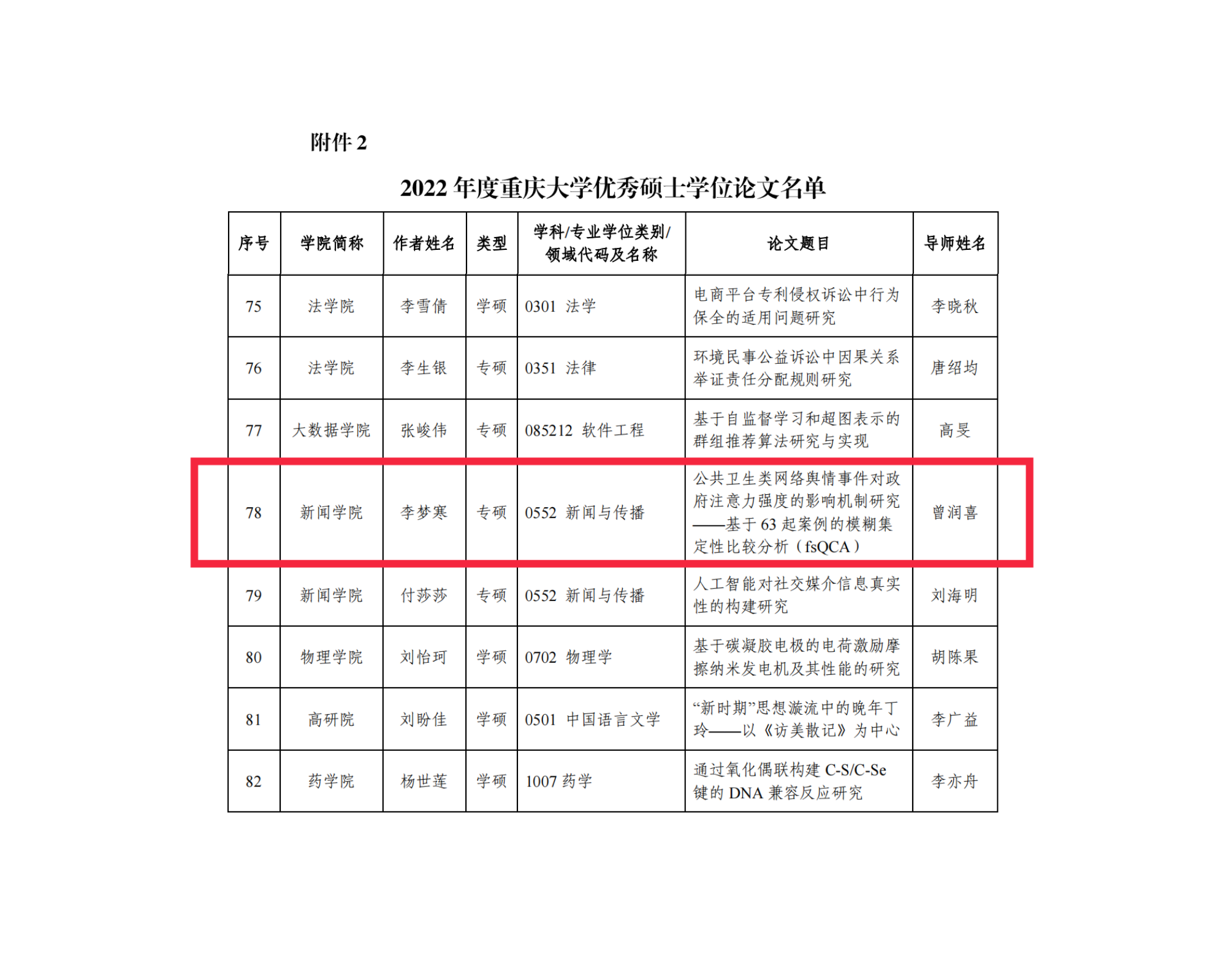 2022年12月28日,重庆市教育委员会公布了《2022年重庆市优秀硕士学位论文评选结果》,重庆大学共有38篇硕士学位论文获选2022年市级优秀硕士学位论文。重庆大学新闻学院2018级硕士生李梦寒的论文《公共卫生类网络舆情事件对政府注意力强度的影响机制研究——基于63起案例的模糊集定性比较分析(fsQCA)》榜上有名,该文的指导教师为曾润喜教授。
